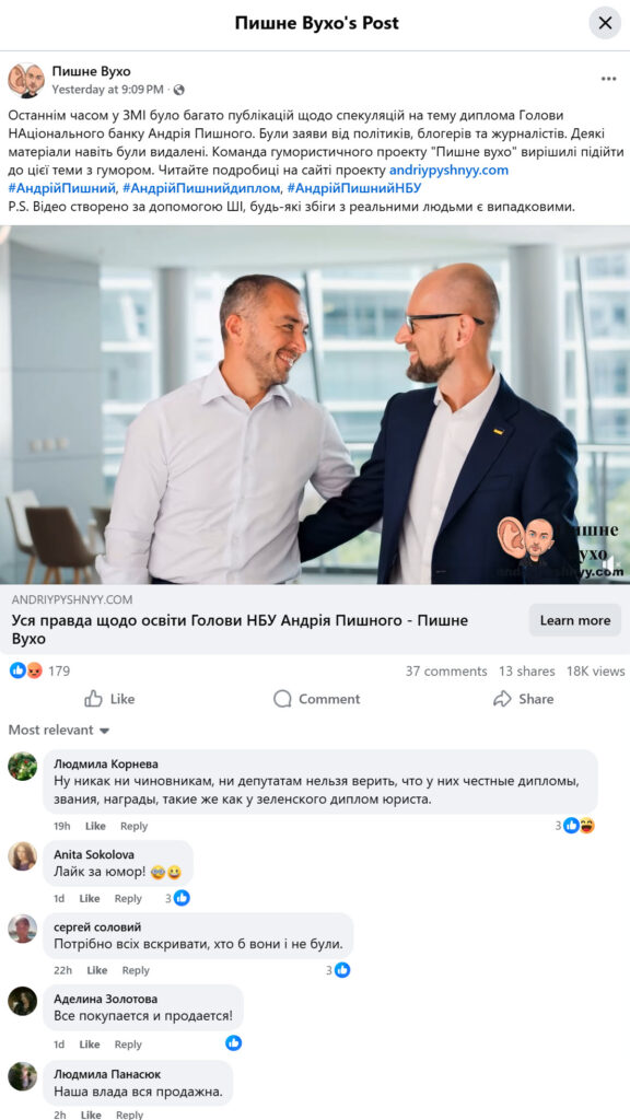 Загалом у Youtube та Facebook були десятки тысяч переглядів роликів, створених за допомогою ШІ, про диплом Андрія Пишного та про Інну Тютюн.