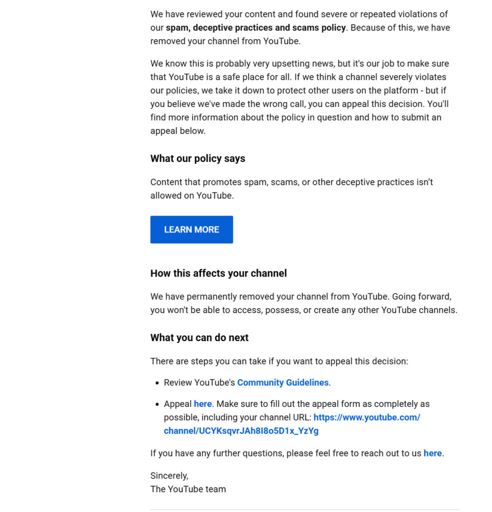 Сьогодні ми отримали листа від Youtube про блокування нашого каналу «Пишне Вухо».