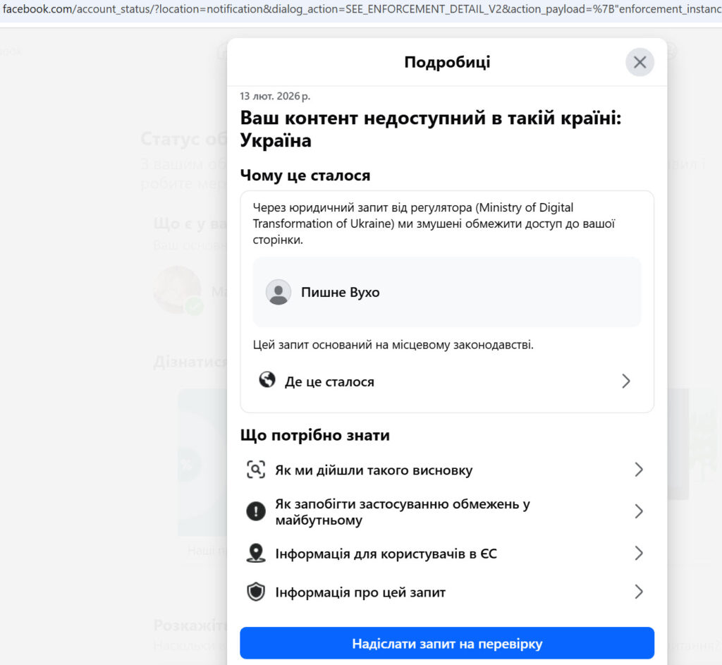 Кажуть, що сонцесяйний Андрій Григорович так збудився, переглядаючі наші відео та інші інформаційно-гумористичні матеріали, що відволікся від «тем та схем» та побіг чи когось з посіпак відправив до Мінцифри з копійчиною або проханням заблокувати нашу сторінку на Facebook. Звісно, що «американські» друзі не відмовили.